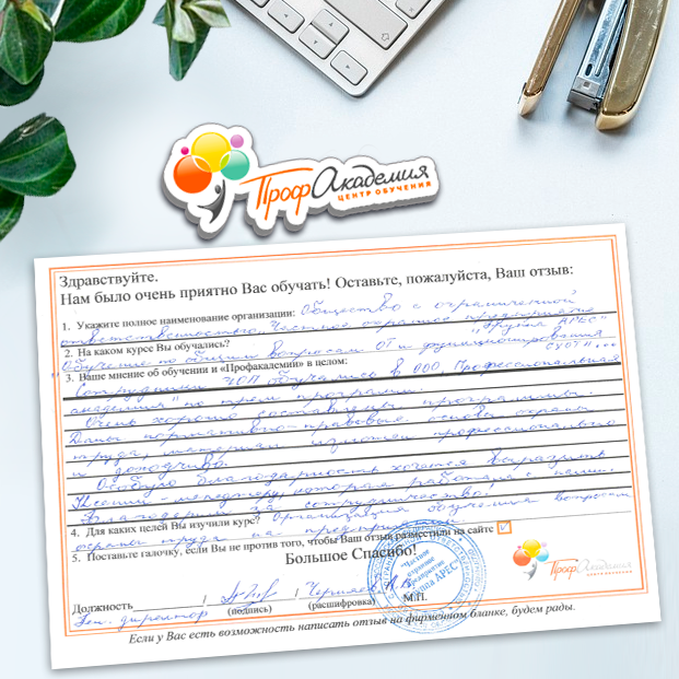 Сотрудники ЧОП обучались в ООО "Профессиональная академия" по трем программ. Очень хорошо составлены программы. Даны нормативно-правовые основы охраны труда, материал изложен профессионально и доходчиво. Особую благодарность хочется выразить Ксении-менеджеру, которая работала с нами. Благодарим за сотрудничество!